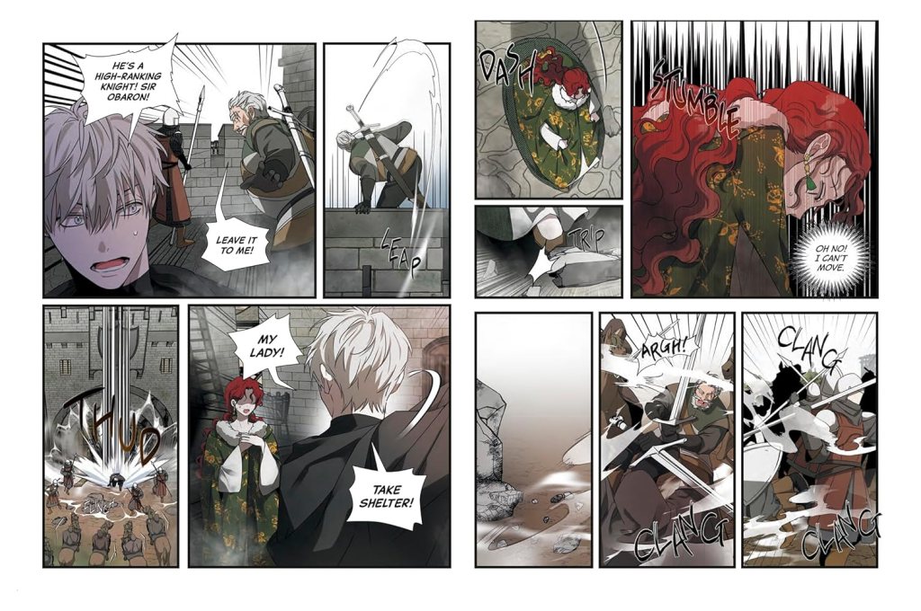 Under the Oak Tree is set in a medieval fantasy world. In the graphic novel, the character visuals and background scenery have a metallic and earthy color scheme, consisting of dark blues, browns, greens, and grays, which is befitting for medieval times. The color scheme creates a dark atmosphere, appropriate for this volume because the story is set in winter and the characters are facing war and isolation. The moody visuals emphasize the somber events.